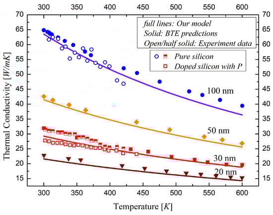 - Liu, W.; Asheghi, M. Thermal conduction in ultrathin pure and doped single-crystal silicon layers at high temperatures. J. Appl. Phys. 2005, 98, 123523. [Google Scholar] [CrossRef]