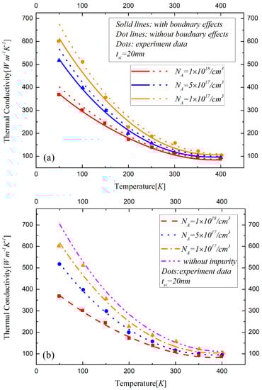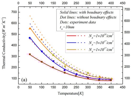 Figure 8 shows the influences of the doping concentration and the silicon layer thickness on the fitting goodness of the thermal conductivity model, considering the boundary scattering effect. It indicates that the model will possess a high reliability for thermal conductivity prediction in sub-10 nm and heavy doping concentration silicon layers due to the fierce boundary reflection scattering.