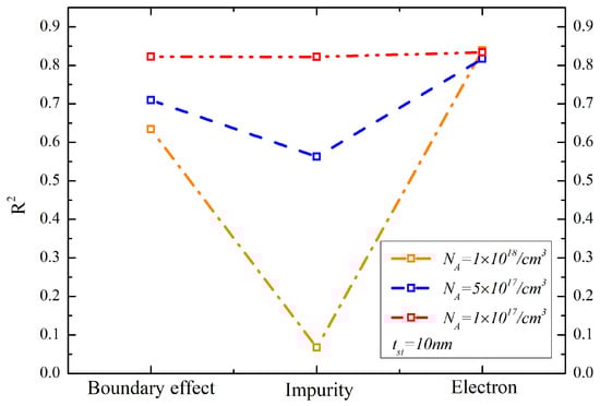 The reliability of the thermal conductivity model determined by the boundary, impurity-phonon and electron-phonon scattering mechanisms in the 10-nm silicon layer is quantified in Figure 9. The absence of a scattering mechanism in the model will make the coefficients of determination less than 0.85 in the doped silicon layer. Moreover, when the impurity-phonon scattering is ignored in the doped 10-nm silicon layer, the coefficient of determination is less than 0.1. This means that the model makes no sense for thermal conductivity prediction. The higher doping concentration entails the stronger impact of the boundary scattering and the impurity-phonons on the thermal conductivity. It indicates that all of the scattering mechanisms play an important role in thermal conductivity prediction in the nanoscale SOI MOSFETs. The phonon-boundary scattering dominates the phonon-impurity scattering at low temperatures. Phonon-boundary scattering also contributes significantly to the reduction in the thermal conductivity of silicon layers regardless of the level of impurity concentration.