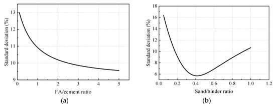 - Based on the PSD optimization, the standard deviation between PSD curve of the designed mixture and the optimal grading curve calculated from the A&A model was less than 10%, and became more steady when the FA to cement ratio exceeded 2.4. The minimal standard deviation appeared when the sand to binder ratio was around 0.4.