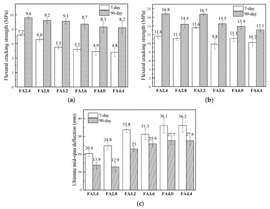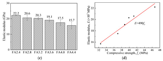 - The 7 day compressive strength and elastic modulus of HVFA-SHCCs were relatively lower than those of normal concrete, and prominently decreased with the increase of FA to cement ratio. For Mix FA3.2, the 7 day strength was only 46.6% of that at the age of 28 days, indicating that the initial strength decreased with the addition of a large amount of fly ash. However, all mixes used in this study could exceed the target compressive strength of 30 MPa at 28 days.