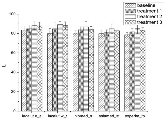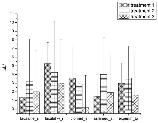 We obtained important differences for ΔL* parameter especially for lacalut_es, aslamed_st and experim_tp (Figure 3).