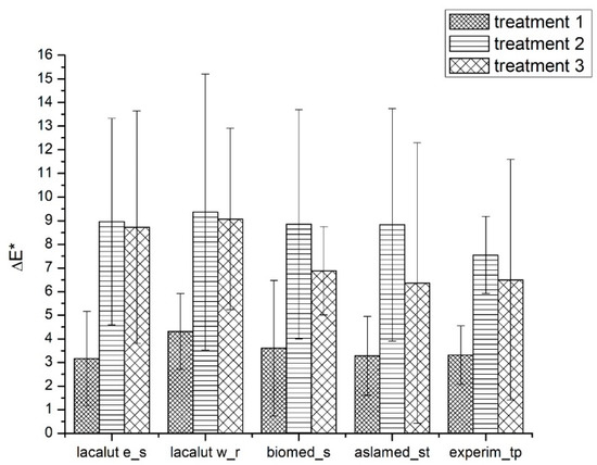After we complete all the treatments on selected teeth, we notice ΔE* variation, with statistical significant differences (Figure 5).