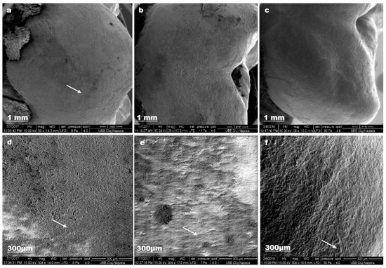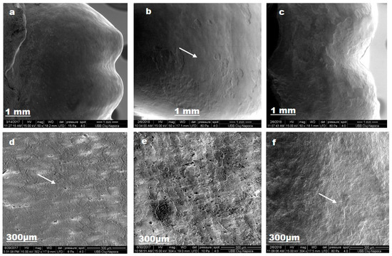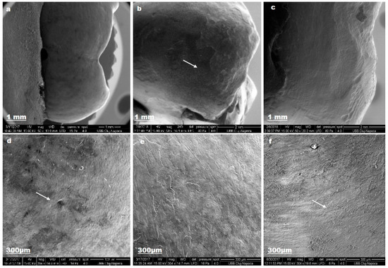 Lacalut_wr SEM images for sound enamel after T1 (a,d), demineralized enamel surface (b,e), enamel surface after T3 (c,f).