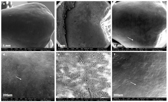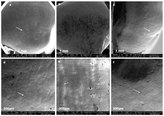 Biomed_s SEM images for sound enamel after T1 (a,d), demineralized enamel surface (b,e), enamel surface after T3 (c,f).