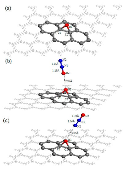 The graphene oxide structure in this article contains an epoxy functional group, as showed in Figure 1a. The oxygen atom (O1) was located above the center of the bond of two neighboring carbon atoms (C1, C2), the lengths of O1–C1 bond and O1–C2 bond are both 1.46 Å, the bond angle of ∠O1–C1–C2 and ∠O1–C2–C1 are both 58.7° (listed in Table 1). Compared with the primary graphene, the carbon atoms C1 and C2, which are under the oxygen atom O1 in the graphene oxide, are protruded from the plane of the primary graphene, while the distance between the two atoms and the plane is 0.42 Å. The length of C1–C2 bond is 1.51 Å, which is larger than the carbon–carbon bond length (1.42 Å) in the primary graphene. Figure 1b,c are the structural diagrams of an N2O molecule adsorbed on the surface of graphene oxide through O-end and N-end, respectively. In Figure 1b, the distance between the N2O molecule and oxygen atom (O1) is 2.97 Å, and the adsorption energy of this N2O molecule adsorbed on the surface of graphene oxide is −0.06 eV, while the distance is 3.35 Å and the adsorption energy is −0.03 eV in Figure 1c. It shows that the adsorption of the N2O molecule on the surface of graphene oxide by O-end is slightly stronger than by N-end, and both belong to physisorption. These adsorption energy values are lower than that of N2O molecules adsorbed on the surface of primary graphene, which is −0.07 eV [25]; this phenomenon indicates that the oxygen atom (O1) on graphene oxide weakens the interaction between the N2O molecule and graphene surface. The Hirshfeld charges of N2O, GO, N2O–GO (O-end) and N2O–GO (N-end) are listed in Table 2; the latter two are the structures of N2O molecules adsorbed onto the surface of graphene oxide through O-end and N-end. It can be found that the charge of each atom in N2O and GO does not change obviously before and after the adsorption of N2O on the surface of graphene oxide by O-end or N-end, which indicates that there is no charge transfer between N2O and GO, and means that the interaction between them is weak.