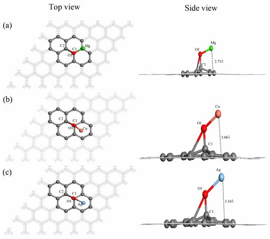 The top view and side view of the structures of the Mg, Cu and Ag atom-modified graphene oxide (Mg–GO, Cu–GO and Ag–GO) are shown in Figure 2. The detailed structural parameters of Mg–GO, Cu–GO and Ag–GO are listed in Table 1. The bond length of the C1–O1 bond in Mg–GO, Cu–GO and Ag–GO is 1.47 Å, 1.47 Å and 1.45 Å, respectively, which indicates that the differences between bond lengths are small. However, the bond angle of ∠O1–C1–C2 increases from 58.7° to 100°, and the distance between the oxygen atom O1 and the carbon atom C2 is greater than 2.26 Å, indicating that after Mg, Cu or Ag doping, the C2–O1 bond breaks on the surface of graphene oxide. Moreover, the oxygen atom O1 shifts from the top of the center of our C1–C2 bond to the top of the carbon atom C1. Thus, the C1–O1 bond becomes almost perpendicular from inclining to the graphene plane. The lengths of the Mg–O1 bond in Mg–GO, the Cu–O1 bond in Cu–GO, and the Ag–O1 bond in Ag–GO are 1.87 Å, 1.80 Å, and 2.10 Å, respectively. The first two are similar to the length of the Fe–O bond in Fe–GO (1.83 Å), but longer than the length of the Al–O bond in Al–GO (1.70 Å) and the Si–O bond in Si–GO (1.70 Å) [42]. It is clear that the interaction between Ag and O in Ag–GO is the weakest among these metal atoms-decorated graphene oxide, since the length of Ag–O1 bond is the longest. The bond angles of ∠C1–O1–Mg, ∠C1–O1–Cu and ∠C1–O1-Ag are 106.7°, 120.4° and 159.4°, respectively. From the top view in Figure 2, it can be seen that the angle between the Mg–O1 bond and C1–C2 bond is approximately 120°, while the angle between the Cu–O1 bond (or Ag–O1 bond) and C1–C2 bond is approximately 180°. In the side view of Figure 2, the vertical distances between the Mg, Cu and Ag atoms and the graphene plane are marked as 2.71 Å, 3.06 Å and 3.16 Å, respectively.