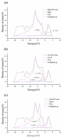 Figure 3a is the local density of state (LDOS) graph of the Mg–GO structure. It can be seen that there are two peaks at 0.13 eV higher than the Fermi energy for Mg-s (red) and −1.89 eV lower than Fermi energy for O-p (blue).