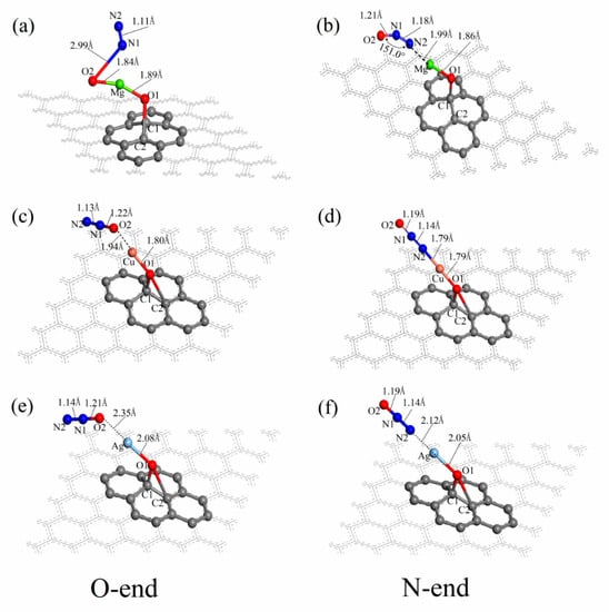 The adsorption structures of an N2O molecule on the surfaces of Mg–GO, Cu–GO and Ag–GO by O-end or N-end had been optimized, and the final structure is shown in Figure 4. It can be seen from Figure 4a that the structure of the N2O molecule has obvious changes after being adsorbed on the surface of Mg–GO by O-end. The distance between the oxygen atom O2 and the nitrogen atom N1 in the N2O molecule increases from 1.19 Å to 2.99 Å, the N1–O2 bond breaks; the distance between the nitrogen atoms N1 and N2 shortens from 1.14 Å to 1.11 Å, which is close to the length of the triple bond in the nitrogen molecule. It indicates that our N2O molecule is decomposed into an active oxygen atom O2 and an N2 molecule, while being adsorbed on the surface of Mg–GO by O-end. The distance between the oxygen atom O2 and Mg atoms is 1.84 Å, and the length of the Mg–O1 bond in Mg–GO elongates a little, from 1.87 Å to 1.89 Å. Figure 4b is the structure of the N2O molecule adsorbed on the surface of Mg–GO by N-end. As the graph has shown, the lengths of this N1–O2 bond and N1–N2 bond in the N2O molecule both elongate slightly, are 1.21 Å and 1.18 Å, respectively. The angle of ∠N2–N1–O2 changes from 180.0° to 151.0°, and the molecular configuration type is transformed from linear to V-shaped. The distance between the N2O molecule and Mg atom in Mg–GO is 1.99 Å.
