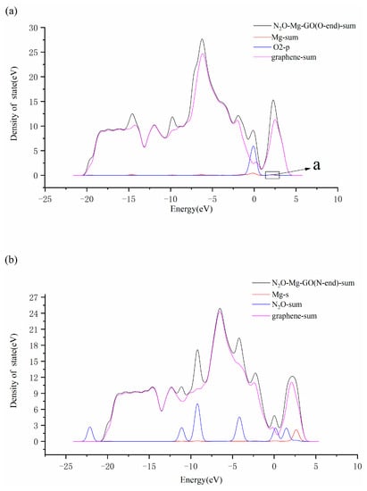 Figure 5a,b are the LDOS of the structures N2O–Mg–GO (O-end) and N2O–Mg–GO (N-end), respectively. As shown in Figure 5a, there are two overlapped peaks near the Fermi level and in the region of 1.8–2.8 eV higher than Fermi level, for Mg-sum and O2-p. It indicates that the 3s bands for the Mg atom and 2p bands for the oxygen atom O2 in N2O are well hybridized, which leads to the formation of the Mg–O2 bond with a length of 1.84 Å. However, there is no obvious overlapping peak between the DOS curves for Mg-s and N2O-p in Figure 5b, indicating that no strong interaction appears between the Mg atom and the terminal nitrogen atom N2 in the N2O molecule.
