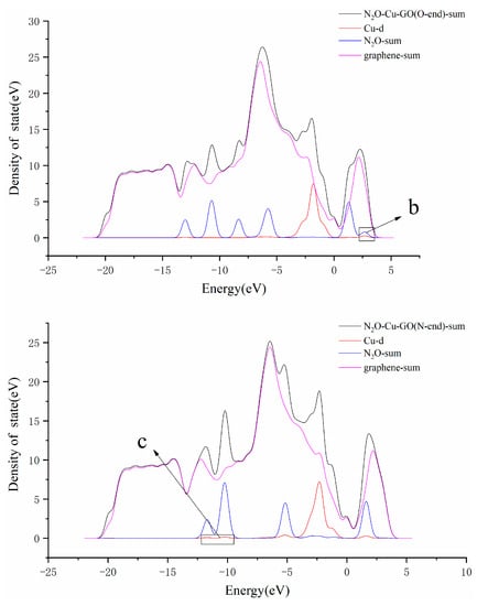 The local density of states of N2O–Cu–GO (O-end) and N2O–Cu–GO (N-end) are showed in Figure 6. It can be seen that there is only an overlapping peak for the DOS curves of Cu-d and N2O-sum, which is at the region of 1.8–2.7 eV higher than Fermi level, in Figure 6a. While in Figure 6b, it can be observed that there are four overlapping peaks for the DOS curves of Cu-d and N2O-sum, two of which are in the region of −12.0~−10.0 eV lower than the Fermi level, while the others are near −5.0 eV lower than and 1.6 eV higher than the Fermi level, respectively. It can be seen that the 3d bands for Cu and the p bands for N2O hybrid well, contributing to the formation of a Cu–N2 bond with a length of 1.79 Å. It indicates that the adsorption of N2O on the surface of Cu–GO by N-end is stronger than that by O-end, and the reason that the adsorption value of the former is larger than that of latter is also explained.