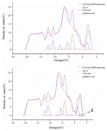 The graphs in Figure 7 are the LDOS of the structures N2O–Ag–GO (O-end) and N2O–Ag–GO (N-end). Observing the DOS curves of Ag-d and N2O-sum, it can be found that there are two overlapping peaks near −5.5 eV lower than the Fermi level and in the region of 2.2~2.8 eV, respectively, which are higher than the Fermi level in Figure 7a. Whereas, no overlapping peak is found in Figure 7b. It shows that that the adsorption of N2O on the surface of Ag–GO by N-end is stronger than that by O-end, and also explains the reason why the distance between N2O and Ag atoms is closer and the adsorption energy is larger when the N2O molecule is adsorbed on the surface of Ag–GO by N-end.