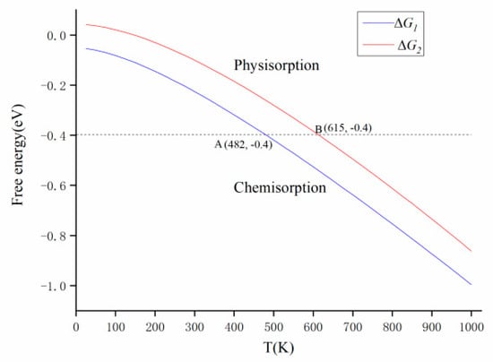 The above analysis showed that the probability of having an N2O molecule adsorbed on the surface of Mg–GO via O-end is larger than that via N-end, while on the surface of Cu–GO, an N2O molecule being adsorbed by the N-end is more likely to occur. The Gibbs free energies of N2O adsorbed on the surfaces of Mg–GO through O-end and Cu–GO through N-end were calculated. The computational formula is: ∆G1 (T) = GN2O-Mg-GO (T) − GMg-GO (T) − GN2O (T) and ∆G2 (T) = GN2O-Cu-GO (T) − GCu-GO (T) − GN2O (T). ∆G1 (T) and ∆G2 (T) are the Gibbs free energies of the adsorption of N2O on the surfaces of Mg–GO through the O-end and Cu–GO through the N-end at the temperature of T, respectively. GN2O-Mg-GO (T), GN2O-Cu-GO (T), GMg-GO (T), GCu-GO (T) and GN2O (T) are Gibbs the free energies of the structures N2O–Mg–GO (O-end), N2O–Cu–GO (N-end), Mg–GO, Cu–GO and N2O at the temperature of T, respectively. The Gibbs free energy formula is G (T) = H (T) – T × S (T), H (T) and S (T) are enthalpy and entropy at the temperature of T, respectively. The calculation results are shown in Figure 8. When│∆G│> 0.4 eV, the adsorption of N2O on the surface is strong, which could be classified as chemisorption; when│∆G│< 0.4 eV, the adsorption of N2O on the surface is weak, which could be seen as physisorption. From Figure 8, it can be found that when the temperature T1 > 482 K = 209 °C, and the Gibbs free energy│∆G1│> 0.4 eV, the adsorption of N2O on the surface of Mg–GO by the O-end is a chemisorption reaction. While for the adsorption of N2O on the surface of Cu–GO by N-end, the temperature T2 > 615 K = 338 °C, and the Gibbs free energy│∆G2│> 0.4 eV. It shows that the temperature range, in which the chemisorption of N2O on the surface of Mg–GO can successfully occur, is larger than that of Cu–GO.