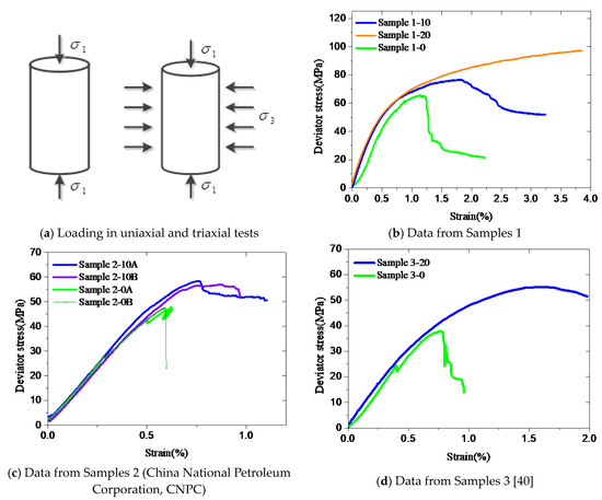 Figure 1a shows the schematics of stress loads applied on specimens during uniaxial and triaxial compressive tests. The surrounding temperature was approximately 22°C for Samples 1 and 2, and 60°C for Sample 3. Figure 1b–d presents the stress responses in the compression experiments, i.e., deviator stress (y-axis) as a function of axial strain (x-axis). Deviator stress is equal to σ1-σ3. σ1 is the axial stress and σ3 is the confining stress. It can be seen that both the deviator stress and the ultimate strain are significantly enhanced under confining conditions. In addition, the enhancement increased with the level of confinement in Figure 1b.
