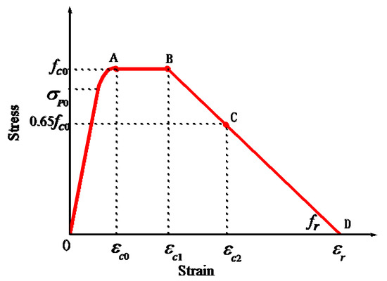 The strain increases rapidly after the peak point A, but the cement continues to resist the loading rather than immediately failing. A horizontal straight line or slightly ascending straight line is used in confined cementitious materials to describe the peak stress portion [31,38,39]. Besides this, some studies reported strain doubling in this phase [37,49]. Hence, this study assumes the peak stress portion (AB) to be a horizontal line, which extends from εc0 to 2εc0 (Figure 2). The equation for the peak stress portion is described as follows: