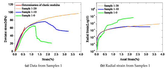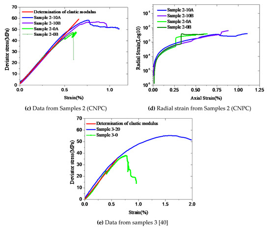 Elastic modulus affects mechanical properties of cement during the elastic deformation phase. The comparisons of the uniaxial and triaxial test data shown in Figure 3 demonstrate that the linear elastic phase of confined cement is basically close to that of unconfined cement. Particularly, the elastic modulus of confined cement is very close to that of unconfined one. For the Sample 2 series, the strain trends of uniaxial and triaxial tests are very similar when the axial strain is less than 0.25% (Figure 3d). This indicates that within the elastic limit, mechanical properties are little affected by confinement and the confinement effect is triggered once micro-cracks develop in the cement due to excessive loading. Therefore, in this study, elastic modulus E and the stress at the linear limit σp0 of confined cement are considered to be the same as that of unconfined cement.