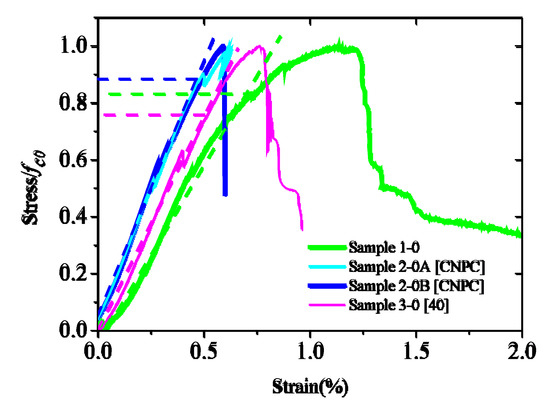 It can be seen from the uniaxial test results (Figure 4) that the stress–strain curve is basically linear when the stress is below 70% of fc0 and begins to deviate from the straight line when it is between 70% to 90% of fc0. Therefore, the stress at the linear limit (σp0) of confined cement is expected to be between 0.7 fc0 and 0.9 fc0. If σp0 = φfc0, then φ can be taken as the range between 0.7 and 0.9.