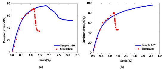 Simulations and triaxial test data for Sample 1. (a) Sample 1-10; (b) Sample 1-20.