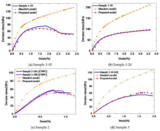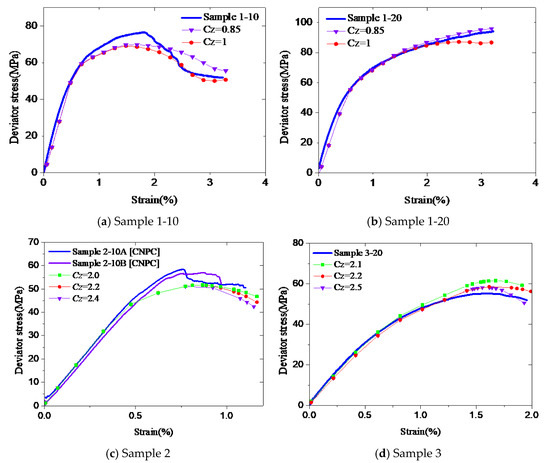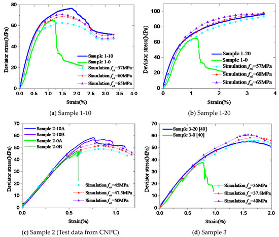 As discussed in Section 3, the strength of confined cement in the model, fc0, is equal to that of unconfined cement obtained from uniaxial test data. The peak stresses in the uniaxial tests were 60 MPa for Sample 1, 47.5 MPa for Sample 2, and 37.8 MPa for Sample 3. To investigate the effects of the fc0 on the accuracy of the model, a parametric study has been conducted. The trial values of fc0 are 57, 60, and 65 MPa for Sample 1-10 and 1-20, 45–50 MPa for Sample 2, and 35–40 MPa for Sample 3. Other parameters of the stress–strain model are presented in Table 2. Figure 9 shows the numerical and experimental results for all samples. The deviator stresses increase slightly with the value of fc0. In fact, all numerical results are close to the experimental values, as long as fc0 in the model is taken as a value near the strength of unconfined cement obtained from uniaxial tests. It indicates that the suggested value of fc0 provides stable and accurate simulation results.