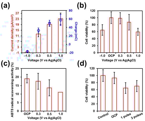 The radical scavenging activity of cells seeded onto the stainless steel was halved along with cell viability when a voltage of 1.0 V was applied (