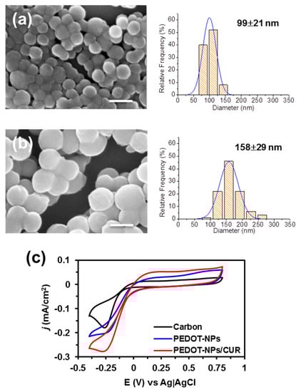 Figure 2). Electroactivity and electrostability of the PEDOT-NPs and PEDOT-NPs/CUR were evaluated by means of cyclic voltammograms. The voltammogram area increases when the electrodes are coated with PEDOT-NPs and PEDOT-NPs/CUR (