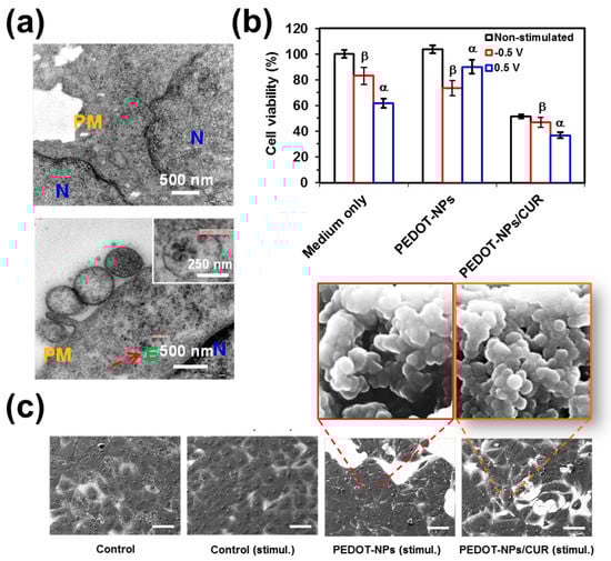 Figure 1b shows that the cell viability underwent a significant reduction when voltages of 1.0 and −1.0 V were employed, diminishing in both cases to ~60%. Amazingly, the electro-regulated release of CUR from PEDOT-NPs/CUR started at −0.5 V with 10%, and grew to 30% and 38% when the reductive voltage decreased to −1.0 and −1.2 V, respectively [