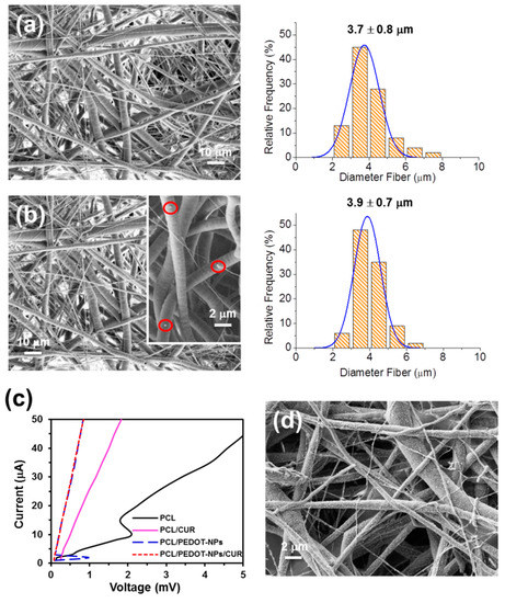 Figure 4a,b display representative SEM micrographs of PCL and PCL/PEDOT-NPs/CUR fibres, respectively. Electrospun PCL mats are formed by a random distribution of homogeneous microfibres with a diameter of 3.7 ± 0.8 µm and a smooth surface. Instead, PCL/PEDOT-NPs/CUR microfibres, which present a diameter of 3.9 ± 0.7 µm, were proven to exhibit individually segregated PEDOT-NPs. These were mainly distributed inside the polyester matrix, even though a few PEDOT-NPs were also located at the surface of the polyester matrix, as is illustrated in