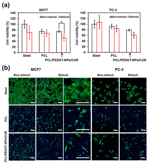 Figure 5b compares representative images of PC-3 and MCF7 cells cultured on steel pins and both PCL and PCL/PEDOT-NPs/CUR fibrous mats that were not perturbed during 48 h (non-stimulated) and that were electro-stimulated by applying 1 pulse of 0.5 V for 1 min just after 24 h of culture and, subsequently, remained unperturbed until reaching 48 h. As was expected, colonization and spreading of these substrates are consistent with the cell viabilities displayed in
