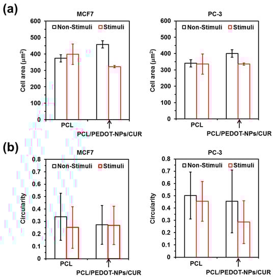 Figure 6). These analyses were conducted using representative confocal microscopy micrographs of cells spread onto PCL and PCL/PEDOT-NPs/CUR fibrous mats. Regarding cell area measures, results indicate that the major observable difference between the non-stimulated and the electro-stimulated substrates corresponds to the decrease in the cell area for the PCL/PEDOT-NPs/CUR matrices. In contrast, this change is not detected for cells cultured onto PCL scaffolds (