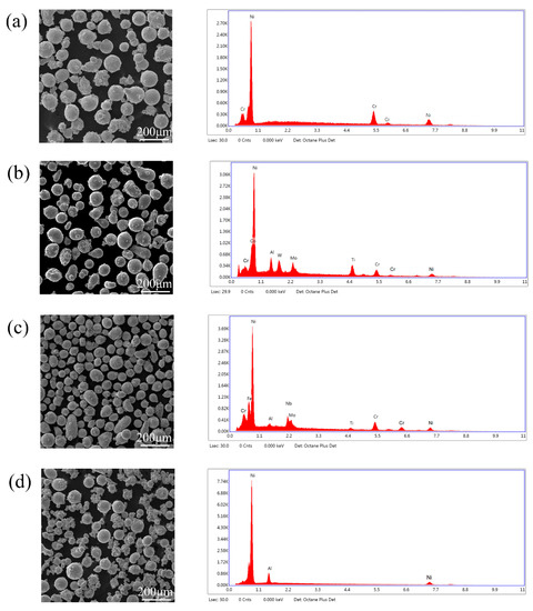 Morphology and energy dispersive spectrometry (EDS) results of Ni-based alloy powders. (a) Ni 107; (b) Ni 183; (c) Ni 202; (d) Ni 357.