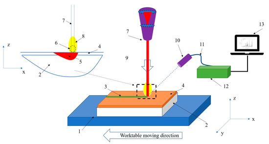 Schematic diagram of the experimental system. 1: Worktable; 2: Substrate; 3: Cladding zone; 4: Pre-placed layer; 5: Molten pool; 6: Detection area; 7: Laser beam; 8: Plasma; 9: Shield gas orientation; 10: Detection sensor; 11: Optical fiber; 12: Smart manufacture optical monitor system (SMOMS); 13: Computer with analysis software.