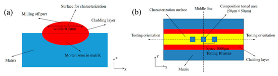 Schematic diagram of measurement of microstructure and composition of cladding layer. (a) sample preparation; (b) composition testing by area model.
