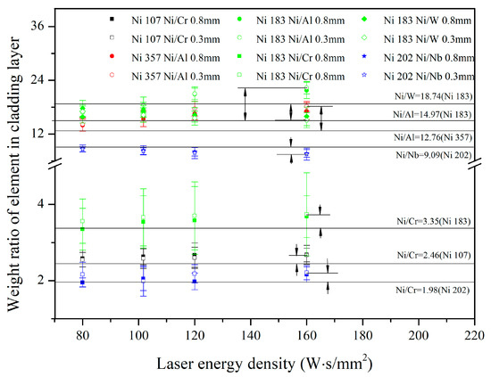When the thickness of the pre-placed powder layer was 0.8 mm, the weight percent of Fe just showed a slight increasing trend versus the laser energy density. Moreover, the absolute increment of Fe was similar among four kinds of Ni-based cladding layers; when the thickness was 0.3 mm,for Ni 107 and Ni 202, the weight percent of Fe rose stably following the enhance of laser energy density. For Ni 183, the growth of weight percent of Fe became sharp. For Ni 357, the weight percent of Fe indicated a rapid increaset only when the laser energy density increased from 107 to 120 W·s·mm−2. The direct cause of the complex variation on the concentration of Fe could have been the different heating processes among four kinds of Ni-based powders. For the alloy powder used in the experiment, the thermal conductivity, refractive index, and absorptive could have varied with the concentration changes of compositions [18,19,20,21].