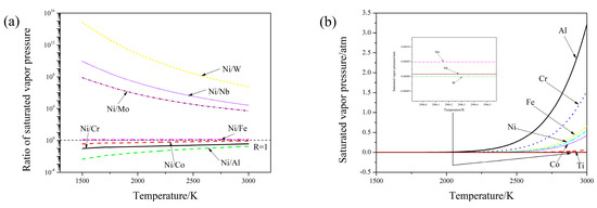 Calculation of saturated vapor pressure among different elements. (a) Ratio of saturated vapor pressure. (b) Saturated vapor pressure.