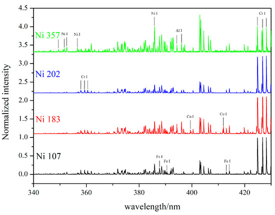 The vaporized material diffused from the surface of molten pool and was induced by the laser beam. During the interaction, the transition of extranuclear electron generated the energy emission and formed the spectral lines with special wavelength—this is known as laser induced plasma plume [25]. Figure 8 shows the laser induced spectra for four kinds of Ni-based alloy powders during the laser cladding process. By matching with the standard wavelength of spectra lines offered in the NIST (National Institute of Standards and Technology) database [26], some of atomic spectral lines were found and are marked in Figure 8, including Fe I, Cr I, Ni I and Al I. The atomic spectral lines emitted by the refractory element, such as W, Nb and Mo, could not be observed in the spectra.
