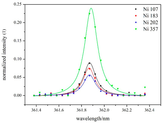 The following spectroscopic analysis was based on the assumption that the plasma was optically thin and in a local thermodynamic equilibrium state [13,27,28,29]. Because of the Stark effect, the spectral lines were typically broadened to the Lorentz profile; hence, the original data were firstly removed the baseline, and then they were processed by the Lorentz fitting [30,31,32,33]. Finally the integral area of peak was set as the intensity of spectral lines. The typical processing results of the spectral lines are shown in Figure 9.