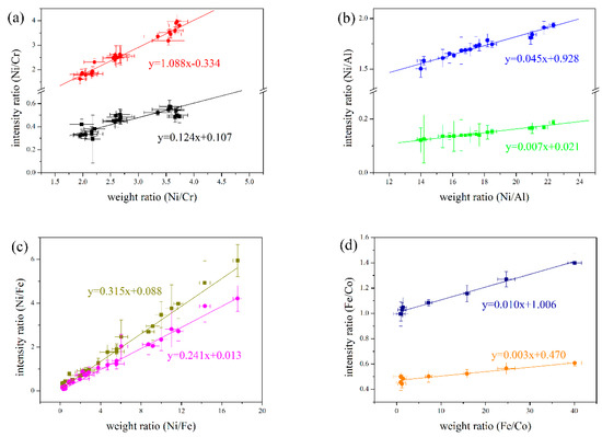Figure 10 displays the calibration curves for different elements, including Ni/Cr, Ni/Al, Ni/Fe and Ni/Co. The weight ratio between two elements was calculated by the real component percent in four kinds of laser cladding layers, and the intensity ration between spectral lines was calculated by the data collected during the real laser cladding process.