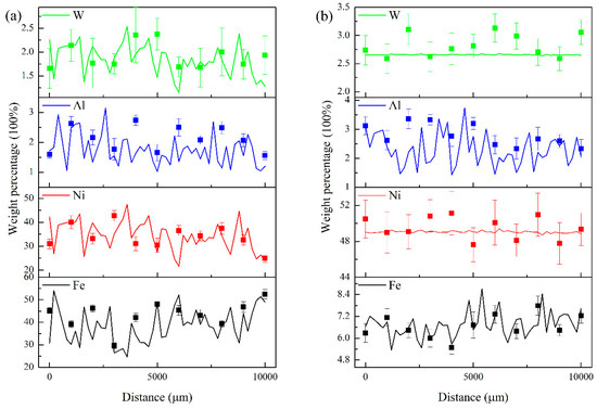 Monitoring results of weight percentage of Fe, Ni, Al and W, the points show the composition tested by EDS, and the lines show the composition predicted by the emission spectroscopy. (a) 800 W, 5 mm/s and 0.3 mm of thickness; (b) 2000 W, 20 mm/s and 0.8 mm of thickness.