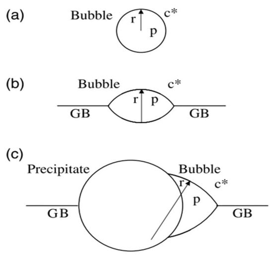 With the same nucleus volume, the interfacial equilibrium between surface of a bubble and grain boundary (GB) can be seen in Figure 2b, and the equilibrium between a bubble and a GB-precipitate can be seen in Figure 2c.