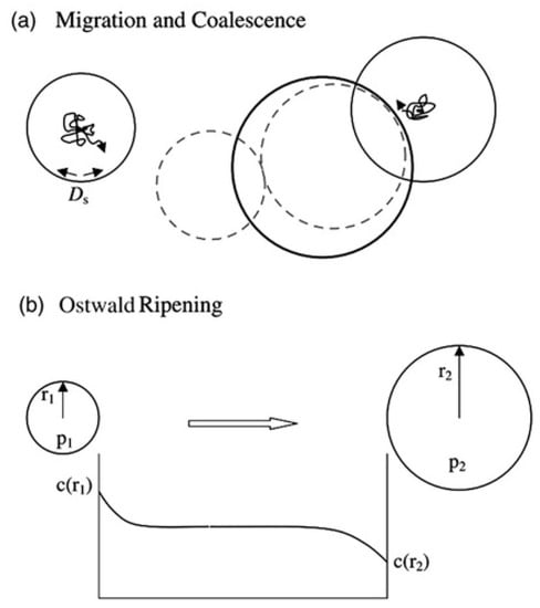 - Gruber, E.E. Calculated Size Distributions for Gas Bubble Migration and Coalescence in Solids. J. Appl. Phys. 1967, 38, 243–250. [Google Scholar] [CrossRef]