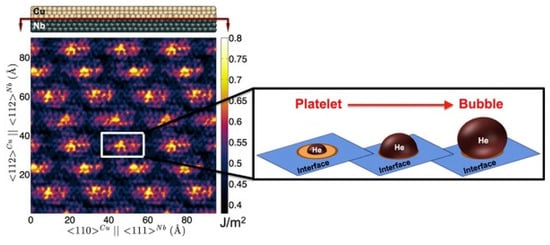 At the same irradiation condition, a spherical bubble, ~2 nm in diameter, forms within a crystalline solid, while a platelet-shaped He-filled bubble generates at an interface. Also, the volume of such platelets was nearly three times smaller than that of bubbles in face-centered cubic (FCC) Cu with the same number of He atoms [29]. Thus, platelets store He atoms more efficiently than spherical bubbles and leads to less He-induced hardening and swelling prior to void formation. Therefore, as platelets do not degrade materials as much as bubbles, heterogeneous interfaces can make materials possess more irradiation resistance.