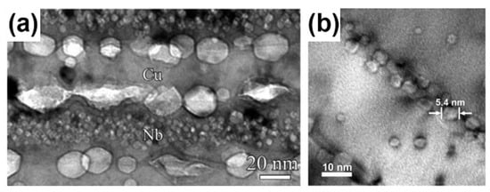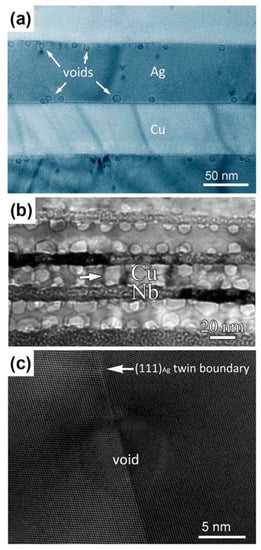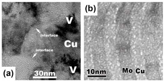 Semi-coherent interfaces also have superior irradiation resistance at high temperatures. For example, when 120 nm PVD Cu/Nb experienced He ion irradiation with a dose of at 490 °C, voids generated in the Cu layer and displayed a size range between 4.5 and 43 nm (Figure 13a). In contrast to the Cu layer, bubbles formed in the Nb layer and their diameter was 1 nm [46]. For 5 nm PVD Cu/Nb, voids in Cu layers spanned the whole Cu thickness and elongated between 7 and 11 nm, while the size of bubbles in Nb layers was still about 1 nm (Figure 13b). From these results, we can see bubbles coarsen rapidly and voids form in the Cu layer, and bubbles in the Nb layer do not change at the elevated temperatures. The reasons for this phenomenon are as follows: first, T > 0.5Tm in the Cu layer, the migration of vacancies is easy, and bubbles coarsen rapidly and transform into voids by absorbing interstitials and vacancies. Second, T < 0.5 Tm in the Nb layer, the migration of vacancies is not as easy as that in Cu and bubbles coarsen slowly by absorbing interstitials. Although bubbles grow rapidly and voids form inevitably in the Cu layer at high temperatures, semi-coherent interfaces can confine big voids within the layers and control the distribution of cavities. Also, the size of voids decreases with the increasing density of interfaces.