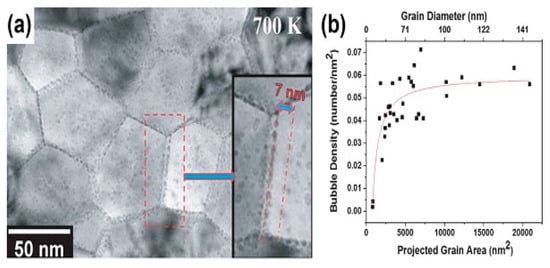 (a) Over-focused bright field TEM images of 10 keV He ion irradiation on nanocrystalline iron at calibrated temperatures of 700 K. (b) Areal bubble density (number/nm2) vs. grain size (area) for 10 keV He ion irradiation on nanocrystalline iron at 700 K [38].