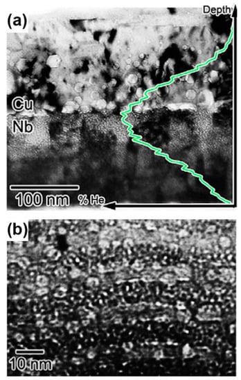 - Zhang, X.; Li, N.; Anderoglu, O.; Wang, H.; Swadener, J.G.; Höchbauer, T.; Misra, A.; Hoagland, R.G. Nanostructured Cu/Nb multilayers subjected to helium ion-irradiation. Nucl. Instrum. Methods Phys. Res. Sect. B Beam Interact. Mater. Atoms 2007, 261, 1129–1132. [Google Scholar] [CrossRef]
