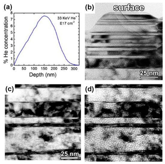- Zhang, X.; Fu, E.G.; Misra, A.; Demkowicz, M.J. Interface-enabled defect reduction in He ion irradiated metallic multilayers. Jom 2010, 62, 75–78. [Google Scholar] [CrossRef]