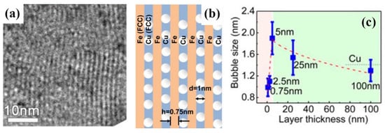 To prove the good sink ability for heterogeneous coherent interfaces, PVD Cu/Fe with 0.75 nm layer thickness is taken for an example [20]. PVD Cu/Fe with 0.75 nm has numerous Cu {111}//Fe {110} interfaces according to X-ray diffraction (XRD) analysis. After irradiation using 100 keV He ions with a dose of at room temperature, the diameter of bubbles is about 1 nm (Figure 17a), which is comparable to that in PVD Cu/V and Cu/Mo experienced the same He ion irradiation. Also, although these Cu/Fe interfaces are coherent, cavities are still confined by interfaces (Figure 17b) and their diameter is curtailed with layer thickness reducing (Figure 17c). In conclusion, nanostructured materials with heterogeneous coherent interfaces can also resist irradiation damage efficiently.