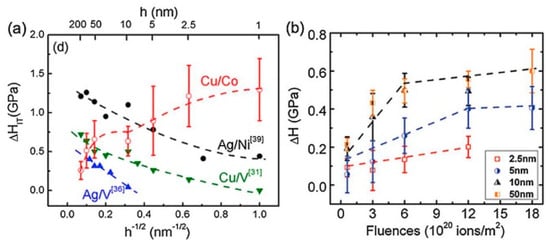(a) Irradiation hardening in He ions irradiated Ag/V, Ag/Ni, Cu/V multilayers scaling with layer thickness. (b) Fluence dependence of irradiation hardening in He ion irradiated Cu/V multilayers [39].