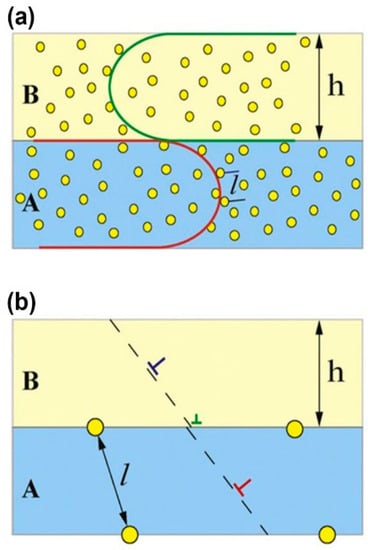Voids can adhere to interfaces or cross interfaces. In Figure 6a,b, voids adhere to interfaces in bulk Cu/Ag and ARB Cu/Nb nanolaminates irradiated using 200 keV He ions with a dose of at 450 °C. However, voids adhere to interfaces on the side of the Ag layer in bulk Cu/Ag and in the Cu layer for ARB Cu/Nb [22,33]. This asymmetrical void–interface interaction is a consequence of different surface energies of the two metals and non-uniformity in interface energy [33]. To confirm this explanation further, first, we introduce void–interface interaction on twin boundaries (TBs) as shown in Figure 6c. TBs possess uniform interface energy and the matrix and twin have the same surface energy, therefore voids cross TBs symmetrically. Second, we take bulk Cu/Ag as an example and use an interface wetting model (Figure 7a) to explain this asymmetrical interaction. The equation regarding a wetting model can be written as [33]: