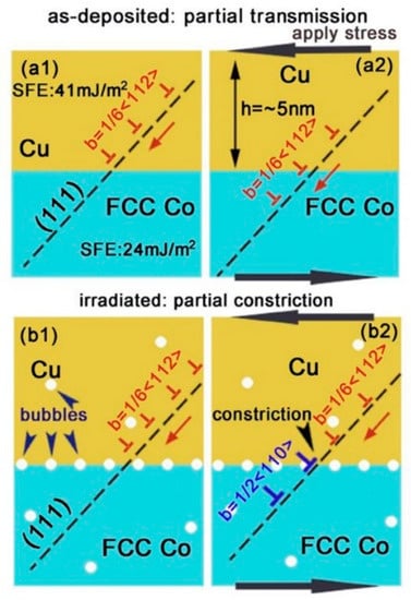 Hypothetical schematics compare strengthening mechanisms in as-deposited and irradiated Cu/Co (100) multilayers at small h (h = 5 nm). (a1, a2) In as-deposited films, partials can trespass layer interfaces owing to the low stacking fault energy of Cu and Co. (b1, b2) However, after radiation, bubbles at the layer interface disrupt the transmission of partials [56].