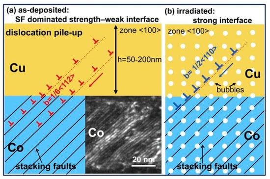 When h < 10 nm, Cu/Co interfaces are coherent and the hardness of as-deposited multilayers is dominated by the interface barrier strength to transmission of partial dislocations. After radiation, cavities at the layer interfaces are typically over-pressurized and strong obstacles [19,54,55], thus these partials have to constrict to full dislocations (in Cu layers) before transmitting to the adjacent Co layers (Figure 20). In other words, cavities can strengthen interfaces and block dislocation transmission. At this length scale, cavities-induced hardening is predominant. When 50 nm < h < 200 nm, Cu/Co interfaces are incoherent and the hardness of as-deposited multilayers is determined primarily by high-density stacking faults (SFs) in Co. After irradiation, cavities distribute both along interfaces and within the layers. However, the average cavity spacing for 100 nm PVD Cu/Co is about 9 nm, which is much larger than the average spacing between SFs (Figure 21). At this length scale, cavity-induced hardening is negligible compared to high density of SFs in multilayers.